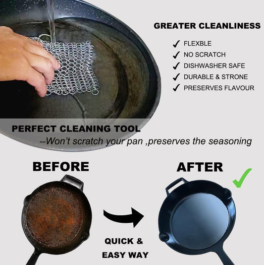 Cast Iron Skillet Cleaner, 316L Stainless Steel Chainmail Scrubber for Cast Iron Pans,Stainless Steel,Glassware,Suitable for Kitchen‘S Cast Iron Scrubber