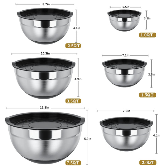Mixing Bowls with Lids: Stainless Steel Mixing Bowls Set - 6 Piece Metal Nesting Mixing Bowls with Rubber Bottom-Black